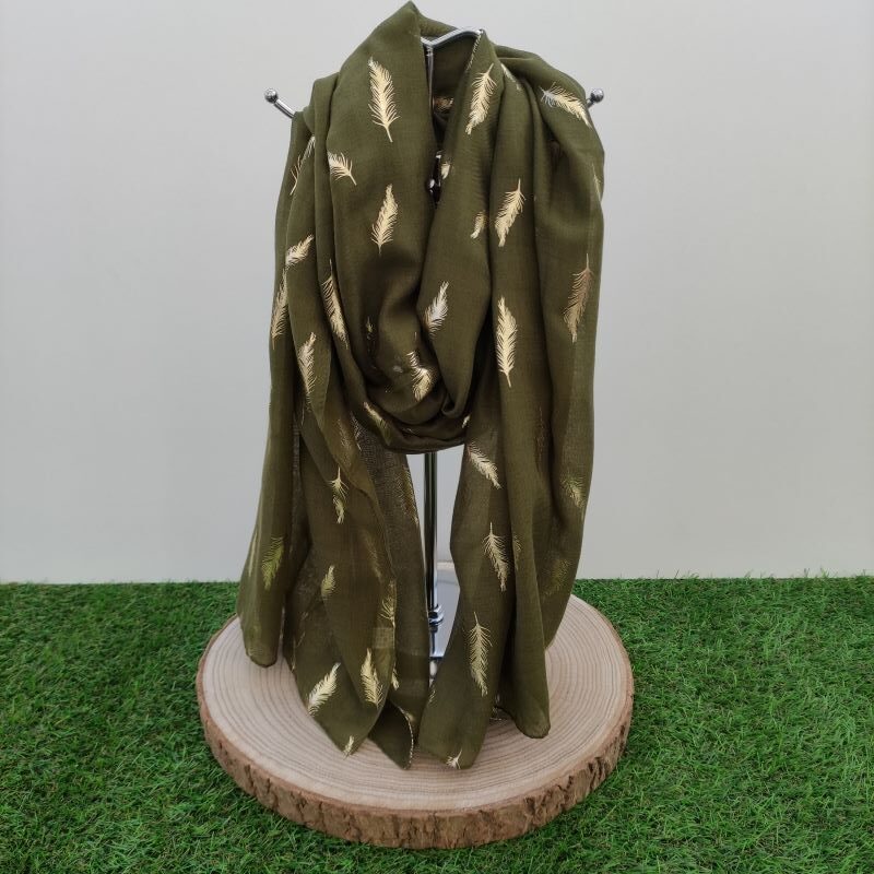Soyez le premier à laisser votre avis sur “Foulard Kaki imprimé brillant doré motif plume”